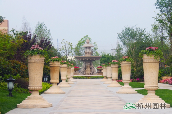 該工程位于杭州城北石祥路與蔡馬河交匯處,為大型綜合性園林景觀工程,內(nèi)容包括園林建筑、苗木種植、硬質(zhì)鋪裝、疊石跌水、景觀小品、土坡造型等。該項目景觀全方位采用規(guī)則式與自然式融合的維多利亞園林風格,如夢似幻,華貴雍容,將維多利亞皇家園林景觀特征表現(xiàn)得淋漓盡致。