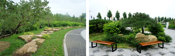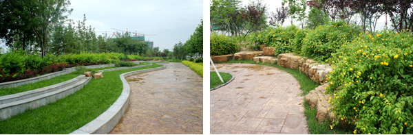 而在道路十字路口的節(jié)點(diǎn)處,則主要是用10cm×10cm的小花崗巖鋪地,鋪出來的路面整潔、平坦,看似簡(jiǎn)單,實(shí)則對(duì)施工技術(shù)要求相當(dāng)高。草坪中的地面鋪裝,則采用花崗巖汀步,用錯(cuò)縫鋪裝法,兩塊花崗巖之間用草皮鑲嵌,就像給每塊花崗巖鑲了一道綠邊,與旁邊的草坪和諧地融為一體。貫穿整個(gè)工程的游憩步道,全部采用"人字形"的鋪裝方法,中間用透水磚、兩邊以花崗巖鑲邊,透水磚價(jià)格不高,用以鑲邊的花崗巖是利用了鋪裝中剩余的邊料,雖然用料簡(jiǎn)單,但通過對(duì)技術(shù)的嚴(yán)格要求,鋪出的路面卻整潔而不失韻味,是一種實(shí)用、環(huán)保、節(jié)約的做法。