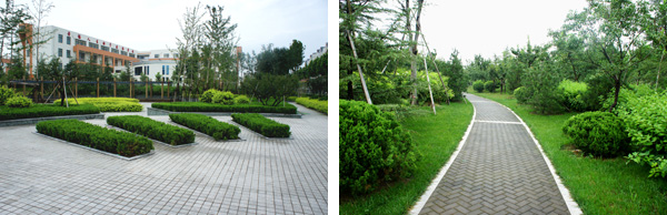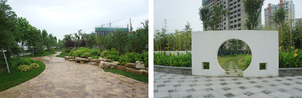每個(gè)景觀節(jié)點(diǎn)上,植物的配置方法都是不一樣的,如在下沉廣場(chǎng),主要是以小龍柏、金葉女貞等小灌木片植成方形或弧形,間或點(diǎn)綴石楠、梅樹,看起來規(guī)整、簡(jiǎn)潔;而在設(shè)計(jì)風(fēng)格為江南園林的南廣場(chǎng)上,是將貴重的造型油松單植,通過不同的組合,形成三個(gè)風(fēng)格相近的綠島,周邊種植美人蕉、玉簪、竹子,并砌起白墻,上面開圓形拱門或圓窗,散發(fā)出詩(shī)意江南的靜謐和婉約氣息。"游憩步道是貫穿整個(gè)景觀的軸線,為了形成曲徑通幽的景觀效果,我們將對(duì)植、孤植、叢植都多種方法結(jié)合運(yùn)用,特別是在三叉路口,多種植海棠、櫻花、杏花等,一方面,花開的時(shí)候,綠葉間繁花點(diǎn)點(diǎn),會(huì)吸引人們不斷向前探尋更多的美景;而花落之后,茂密的枝葉又形成隱隱約約的視覺感受,前方轉(zhuǎn)過彎后風(fēng)景什么樣,又讓人很想去看看。"高經(jīng)理笑著說。