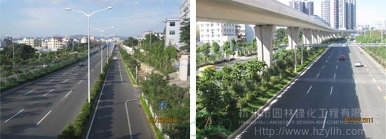 國(guó)道205深圳段改建工程景觀綠化工程G5402標(biāo)段,是深圳市龍崗區(qū)迎大運(yùn)重點(diǎn)景觀工程,位于國(guó)道205深圳段龍崗區(qū)地鐵三號(hào)線愛聯(lián)地鐵站至坪地與惠州市交界處,總綠化面積210000㎡。“以人為本,尊重自然”、“ 處處有綠葉、無(wú)處不飛花”等設(shè)計(jì)理念貫穿于工程始終,整條中央綠化帶位于高架橋下,長(zhǎng)勢(shì)茂盛的各類植物形成一條色彩繽紛的彩帶擁簇著高架橋段,使整條橋段與綠化景觀有機(jī)融合。整條道路的景觀,不僅體顯出一個(gè)濱海大都市獨(dú)有的景觀特色,更彰顯出這個(gè)城市的生機(jī)活力與熱情奔放。