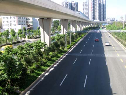 如今,開車行進(jìn)在這條道路上,干凈整潔的路面、開闊通透的視野、清新自然的景觀,給人帶來閑適、愜意的感覺?!耙匀藶楸荆鹬刈匀弧钡木G化理念,體現(xiàn)在景觀中的每個(gè)細(xì)節(jié);自然環(huán)境與城市環(huán)境的密切結(jié)合,使高架橋的道路通行功能與橋下中央綠化帶的生態(tài)功能有機(jī)融合。整條道路,不僅體顯出深圳這個(gè)濱海大都市獨(dú)有的景觀特色,更彰顯出這個(gè)城市的生機(jī)活力與熱情奔放。