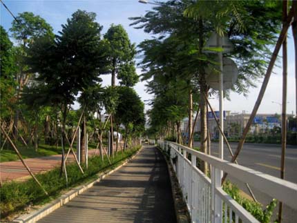 據(jù)深圳分公司總經(jīng)理、工程負(fù)責(zé)人徐向明介紹,細(xì)部以“紅橙黃綠紫”五種花色的植物組合形成大面積的景觀色塊效果,力求在色彩變化和空間組織上完美結(jié)合;強(qiáng)調(diào)季節(jié)的變化,通過色彩不一、品種多樣的花草樹木的有機(jī)配合,形成可觀、可游、可憩的風(fēng)景園林。為此,應(yīng)用的植物達(dá)200余種,其中,上層空間以樟樹、鳳凰木、盆架子、海南蒲桃、菩提榕、尖葉杜英、桃花心等大喬木為骨干,一年四季綠意盎然;中層植物選用不同花期、花色各異的紅花紫荊、大葉紫薇、黃風(fēng)鈴花、紅花繼木、木犀欖、羅漢松、勒杜鵑、非洲茉莉、毛杜鵑等喬灌木,營(yíng)造出“時(shí)時(shí)有花、處處有花”的花海景觀;下層種植花葉發(fā)財(cái)樹、黃金葉、軟枝黃蟬、山菅蘭、紅花繼木、二色茉莉、七彩大紅花、馬尼拉草等花卉地被,營(yíng)造出統(tǒng)一而富于變化的色彩板塊。“中央綠化帶位于深圳市地鐵三號(hào)線高架段橋下,一路飛馳的地鐵,宛如穿梭在綠色的長(zhǎng)龍中,隨著季節(jié)的變化,一路風(fēng)景變化萬千?!毙煜蛎髀詭ё院赖卣f道。