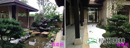 下沉庭院原有景觀過于生硬,空間分界感不強(qiáng),改造后用木柵欄進(jìn)行明確分隔,拆除原有部分鋪裝,以竹子為背景,堆土成坡,種植造型羅漢松,使得此處的景觀猶如微型盆景放大后的效果,讓人眼前一亮。