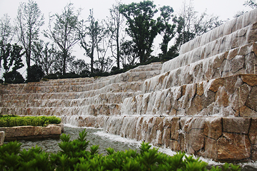 入口水景開闊大氣,行道樹陣整齊劃一。一場歌劇的序曲,不管是澎湃激昂,還是歡快活躍,抑或是柔情舒緩,都將對整個局情起著舉足輕重的作用。入口景觀的作用同樣如此,它是整個園林工程留給人們的第一印象。走進項目主入口,寬40米、高10米的寬闊水景,高達7級的層階落差,水流層層跌落間,水聲轟鳴,仿佛一道瀑布橫掛眼前。3000平方米的地面鋪裝,全部采用50毫米厚的深灰色和芝麻白花崗巖,走在上面,平坦、踏實。兩側(cè)的花壇,邊緣鋪設(shè)手法也呈臺階狀,蘑菇石貼面,花崗巖壓邊,與水景遙相呼應(yīng)?;▔械闹参铮蠈舆x用香樟、銀杏、櫸樹,中層用櫻花、紅葉李,下層用麥冬、水蠟、花石榴及草花,再加上造型樹的點綴,營造出群島效果,使得整個入口景觀莊重典雅,大氣天成。