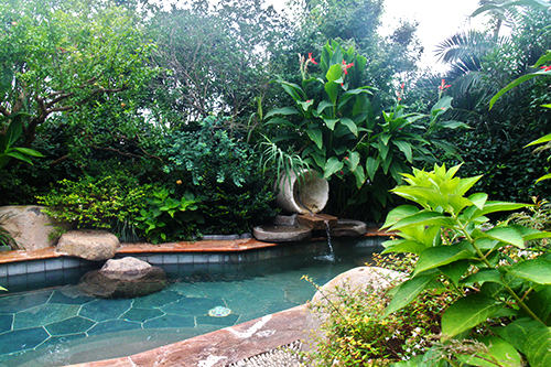 露天泳池?zé)釒эL(fēng)情,溫泉泡池仿若天成。露天泳池區(qū)景觀獨具特色,選用華棕、棕櫚、布迪椰子、加拿利海棗等熱帶植物作為主景,營造出簡約大方、層次分明的濃郁熱帶園林風(fēng)情。為了提高這些熱帶植物的成活率,降低后期的養(yǎng)護成本,這批植物都經(jīng)過馴化,較能適應(yīng)吳江的氣候條件。該區(qū)面積較大,從酒店的觀景平臺上往下看,泳池中間的小島就像彎彎的小船,仿佛要順流而下;水質(zhì)清澈見底,水底大面積的藍色和黃色玻璃馬賽克,營造出波光鱗鱗的效果,流動的線條瞬間充滿了生機和活力,整個泳池仿佛都動了起來。