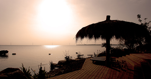 觀景平臺視野開闊,濱湖風(fēng)光水天一色。臨湖的觀景平臺,原色的木質(zhì)鋪裝,素樸的茅草亭,寬大的躺椅,營造出一個自在的小天地。這處觀景平臺,背后是珍珠泉泡池,泡完溫泉,可以直接來到觀景平臺,遠眺太湖的煙波浩渺,水天一色。