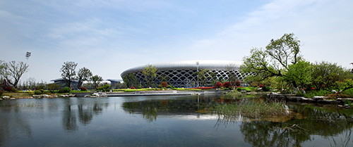 據(jù)夏修智介紹,奧體公園是工程的主要景觀節(jié)點(diǎn),位于奧體中心西北側(cè),面積約5萬(wàn)平方米,是一座集娛樂(lè)、運(yùn)動(dòng)為一體的特色濱水運(yùn)動(dòng)公園,也是整個(gè)奧體中心的“綠肺”。一條蜿蜒的河流將公園劃分為東部運(yùn)動(dòng)區(qū)和西部休閑公園區(qū)。運(yùn)動(dòng)區(qū)緊挨訓(xùn)練中心,東側(cè)便是足球場(chǎng)、籃球場(chǎng)和排球場(chǎng),運(yùn)動(dòng)后就能感受到融入大自然的清新;休閑公園區(qū)包括入口廣場(chǎng)、樹陣廣場(chǎng)、以及河水匯聚而成的小人工湖,湖邊蘆葦迎風(fēng)擺動(dòng),湖水清澈見底,鵝卵石鋪就的湖底清晰可見。整個(gè)奧體公園以中國(guó)古典園林為主、回歸自然的組團(tuán)式造景手法,強(qiáng)調(diào)休閑、幽靜、生態(tài)自然。從西入口廣場(chǎng)的草坡,逐漸過(guò)渡到觀賞性強(qiáng)的觀花、觀葉園林樹種,配合灌木、草木、地被形成人為景觀,從西到東植物次第減少,層次不斷變化,形成了從自然生態(tài)狀綠化到人工幾何狀綠化的逐漸過(guò)渡,讓自然的活力與體育精神融為一體。