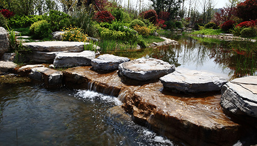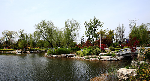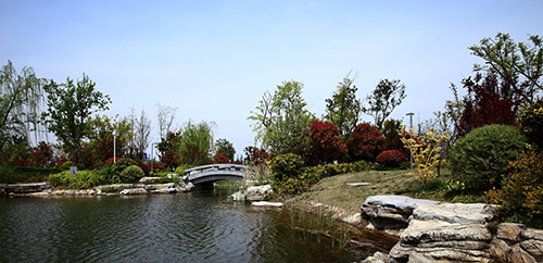 其中,人工湖面積7000平方米,小而精致,可謂是整個(gè)公園的“點(diǎn)睛之筆”。由親水平臺(tái)區(qū),源頭區(qū),中心湖面區(qū),鄰水生態(tài)區(qū),橋梁區(qū)構(gòu)成。湖面區(qū)域貫穿整個(gè)工程,沒(méi)有自然條件的襯托,完全由人工園林造景手法完成,在鄰水景觀帶種植睡蓮、荷花、再力花、千屈菜、鳶尾、蘆葦?shù)人参?,營(yíng)造生態(tài)岸線,同時(shí)選擇其他親水植物,如美人蕉、碧桃、楊柳、水杉作為過(guò)渡和背景,虛實(shí)結(jié)合,營(yíng)造出多方位的景觀效果。湖面雖小,但結(jié)構(gòu)完整,假山疊水,拱橋,原石臨水橋,湖邊卵石生態(tài)群落一應(yīng)俱全。其中,景石主要使用了安徽的靈璧景石,約7000噸,堆疊出水源、暗橋、親水沿岸等景觀。