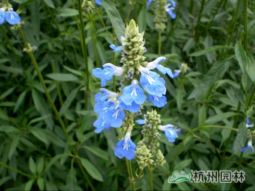天藍(lán)鼠尾草,花天藍(lán)色,開花植株高達(dá)1米5,花期春季。喜溫暖,陽(yáng)光充足的環(huán)境,不擇土壤,耐干旱,但不耐澇,特別喜石灰質(zhì)豐富、或沙性、排水良好的土壤。