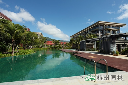 項(xiàng)目位于海南省三亞市亞龍灣椰風(fēng)路南部,整體景觀顯得張弛有度,開闊大氣的廣場(chǎng)鋪裝、宛若綠色地毯般的草坪、色彩豐富長勢(shì)茂盛的植物、藍(lán)寶石般的碧藍(lán)泳池……規(guī)整中不失自然,簡(jiǎn)潔中深藏精致,盡顯現(xiàn)代主義風(fēng)情的園林美景。