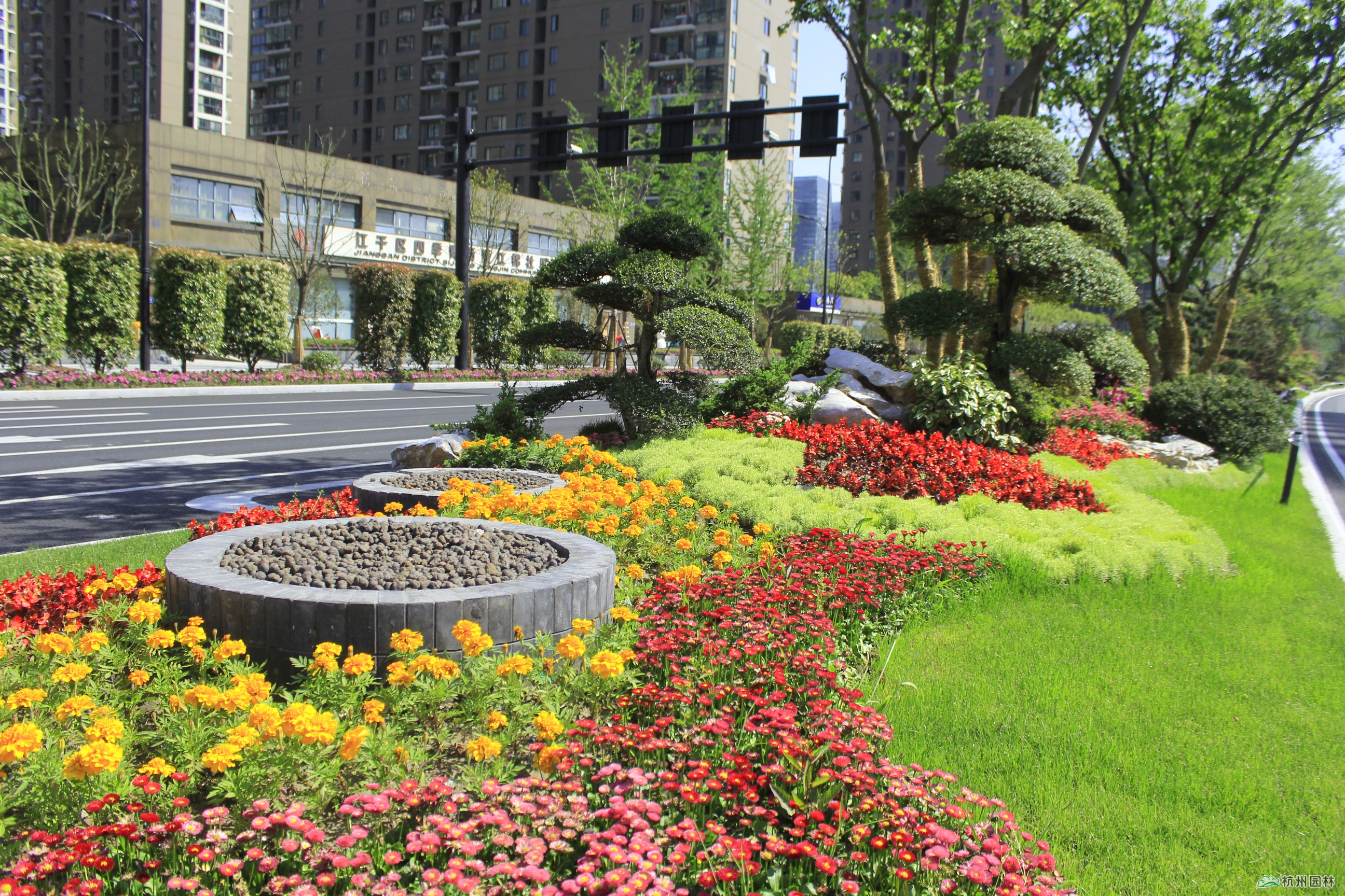 在道路十字路口及一些重要節(jié)點,則通過造型樹、球類植物、景石等的有機結合,采用盆景化的造園手法,景觀效果獨具特色。從而使得新塘路成為四季常綠、三季彩葉、全年花開不斷的“最美”迎賓大道。