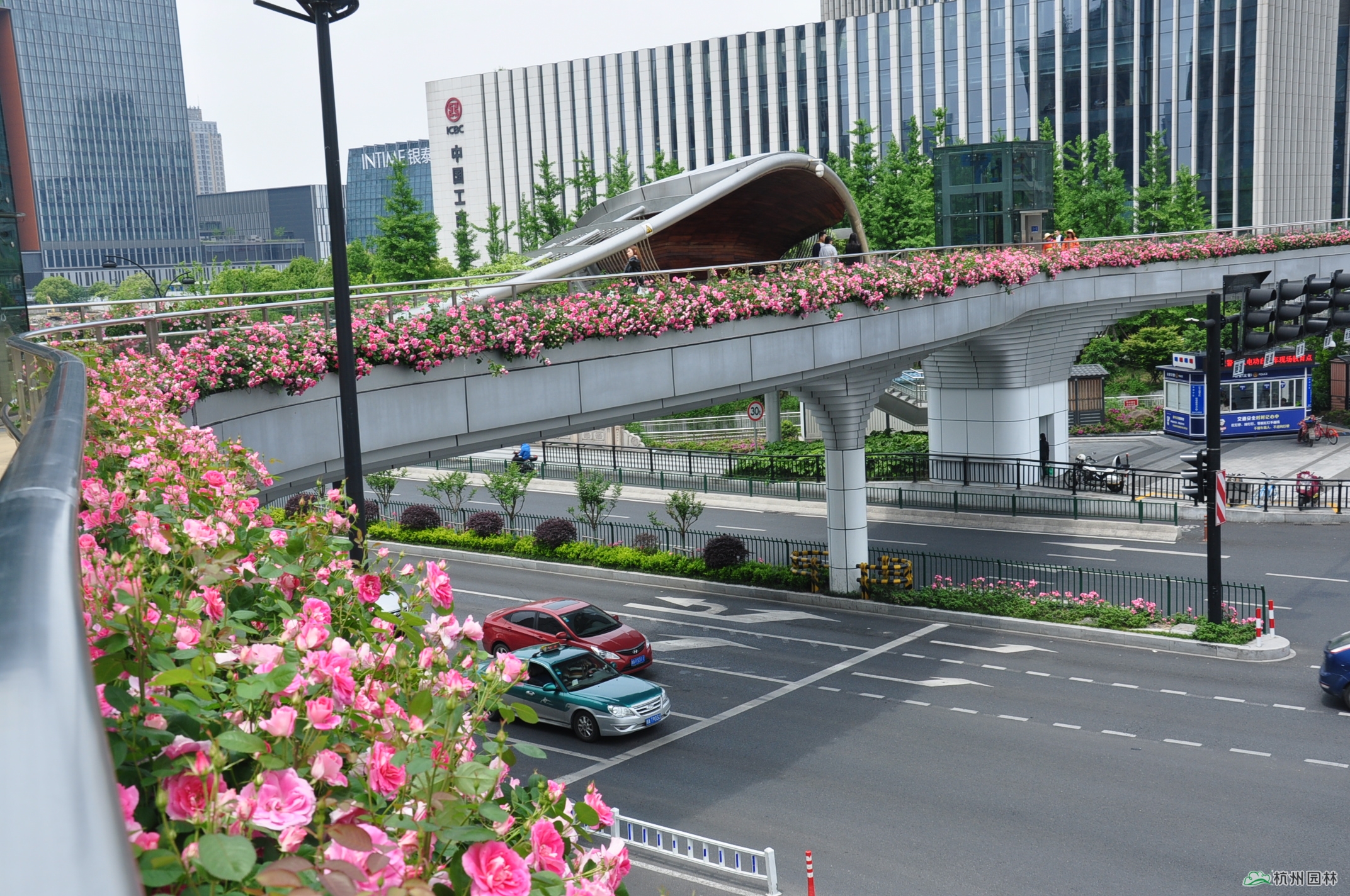 位于新塘路和慶春路交叉口的慶新天橋是新塘路綜合整治工程的標志性建筑之一,也是杭州首座仿生態(tài)學原理的異形人行天橋。橋面獨特的景觀造型宛如一條風景秀美的彩色飄帶,大量月季沿橋面外側護欄種植,月季花盛開時節(jié),橋面仿佛戴上了一條色彩絢麗的花環(huán),美不勝收,充分體現(xiàn)了杭州包容、大氣、開放的時代風貌、都市氣質和國際視野。