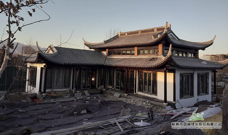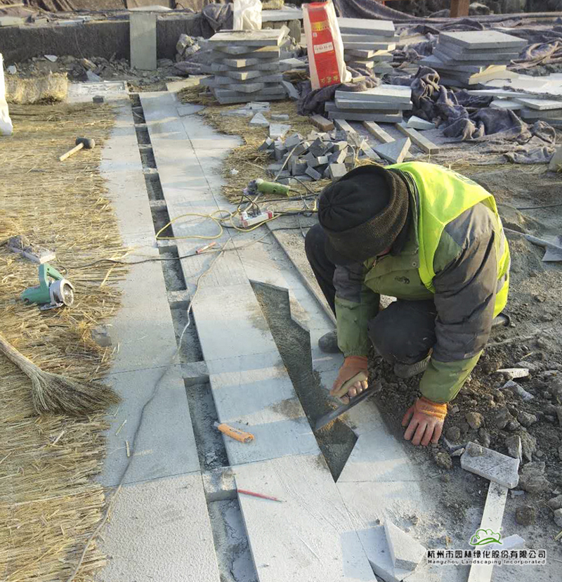 “白天溫度在零度以上時,我們趁著太陽出來、溫度比較高的時候施工;等太陽快下山時,溫度下降很快,這時,我們就停止施工,用毛氈、草墊等將做好的鋪裝蓋起來,再搭上保濕棚保溫。因為如果保暖措施做不到位,白天做好的鋪裝,晚上就會凍壞,導(dǎo)致白天的工作功虧一簣。一些種好的精品樹木,如造型黑松,我們就用很厚的棉被包裹起來,以防凍傷。”回憶起當(dāng)初的施工過程,吳小成依然覺得這是施工中一段時常難熬的時期,“零下15℃的時候,我們還在施工,此時水已經(jīng)全部結(jié)冰,但施工又離不開水,怎么辦呢?我們買了一個加熱器,把冰放到桶里,再把桶加溫化水,以此來滿足施工中的用水需求。”