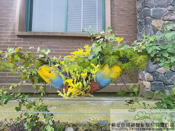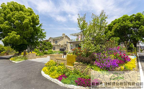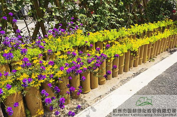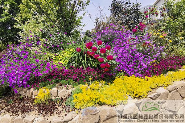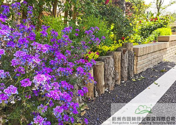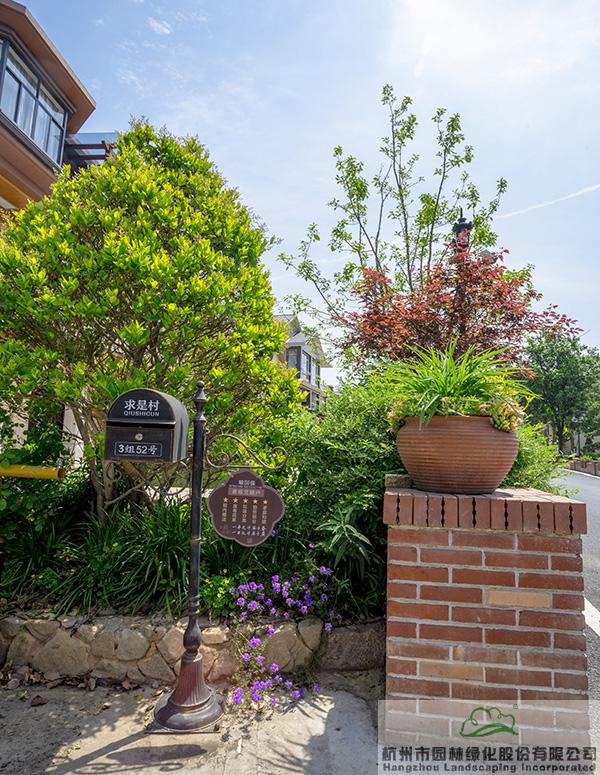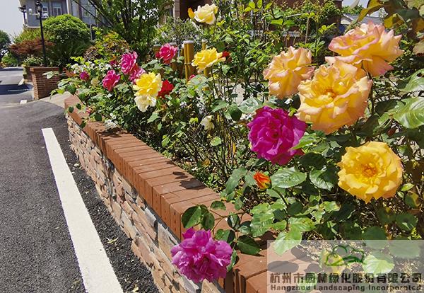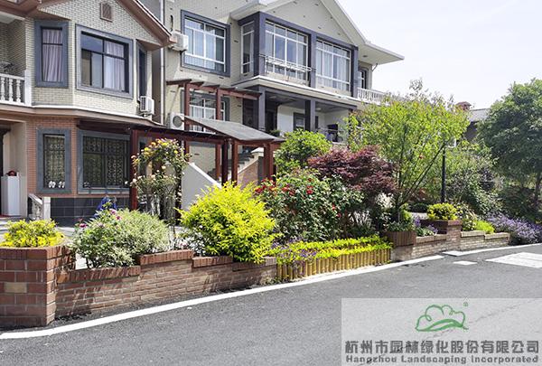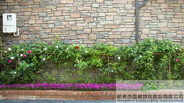 景墻邊的植物配置同樣有講究。利用銀杏、桂花、梅花、紅楓等植物營造上層空間,這些植物具有遮擋作用,能夠為庭院營造一定的私密空間。通過樹狀、球狀、攀援、傘狀、字母等各種形態(tài)的月季,金冠女貞球、龜甲冬青球、銀姬小蠟球、藍(lán)莓、八仙花、小葉梔子、翠蘆莉、花葉千鳥花、藍(lán)山鼠尾草、紫葉狼尾草等小喬灌木,在打造中層空間的同時,和美女櫻、金娃娃萱草、花葉玉蟬花、花葉香桃木、紫菀、澤蘭、礬根、五彩絡(luò)石、石竹等下層空間植物一起,裝飾和襯托景墻,使家家戶戶的景觀更加豐富多變。