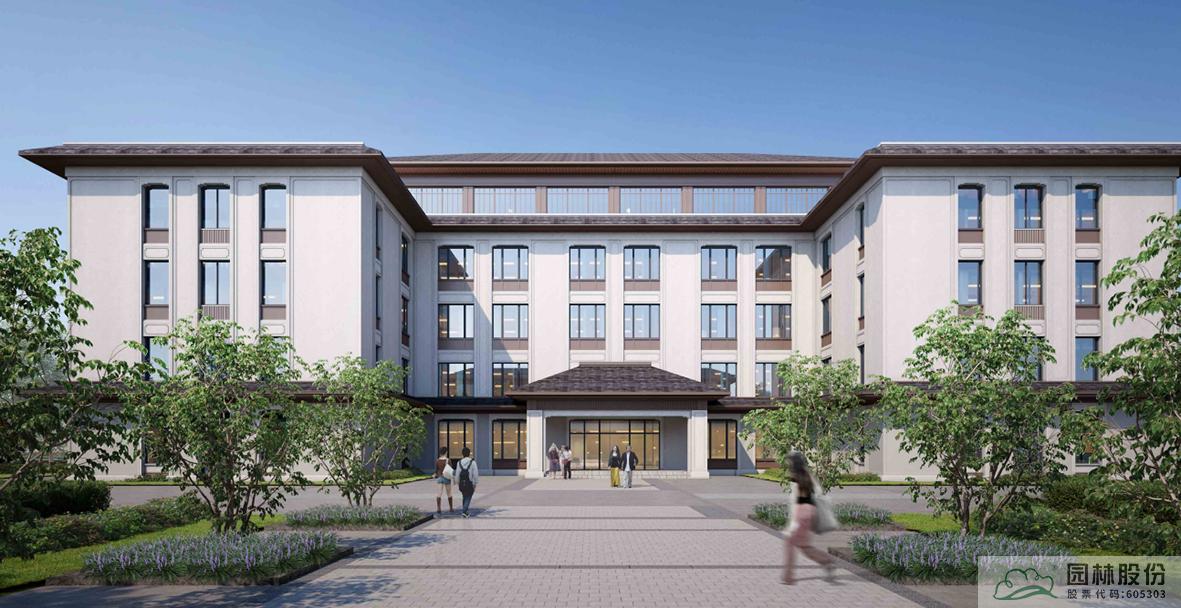 建筑風(fēng)格以新中式為主,在與朔西湖大景區(qū)的風(fēng)格相協(xié)調(diào)下,同時(shí)兼顧了使用功能。東西向的校園主軸線,從主入口廣場起,經(jīng)整齊的樹陣、升旗臺、至綜合教學(xué)樓與綜合服務(wù)中心圍合的中心廣場,并向東延伸到宿舍區(qū),是校園中最主要的視廊,大氣、莊重。