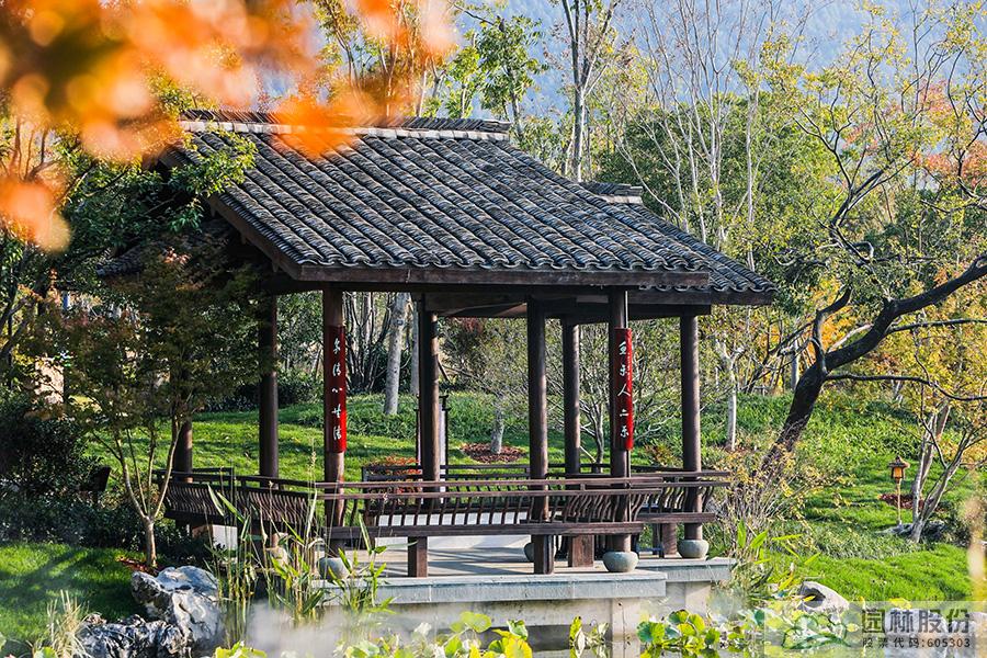 契合展區(qū)主題的樾香亭臨湖而立,雙坡屋面,八柱敞亭,柱子上書五言聯(lián)“魚樂人亦樂,泉清心共清”,盡顯悠閑舒適的情趣。在亭內(nèi)憑欄而坐,側(cè)耳聽風(fēng)雨,迎風(fēng)嗅花香。抬頭遠(yuǎn)望,荷葉亭亭的水面上,有魚兒在水中嬉戲;曲折的長橋上,游人在漫步觀景;水岸邊,銀杏、三角楓、烏桕等色彩繽紛,編織出一幅深秋的美麗畫卷。